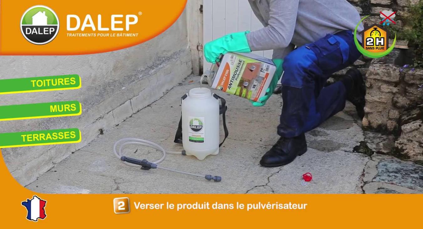 • Appliquez ensuite le produit anti-mousse, fongicide et algicide sur toute la surface du toit. Choisissez une journée sans pluie ni vent. Commencez par le faîtage et descendez progressivement vers les gouttières en appliquant une couche uniforme sur l'ensemble du toit.